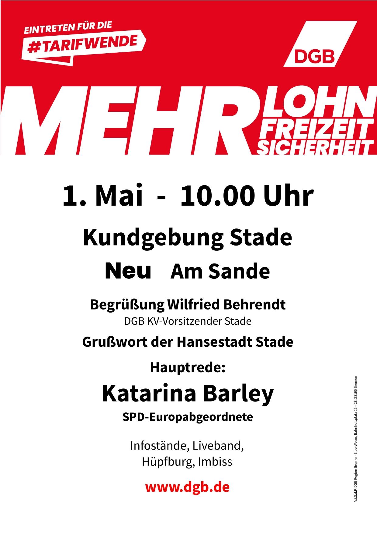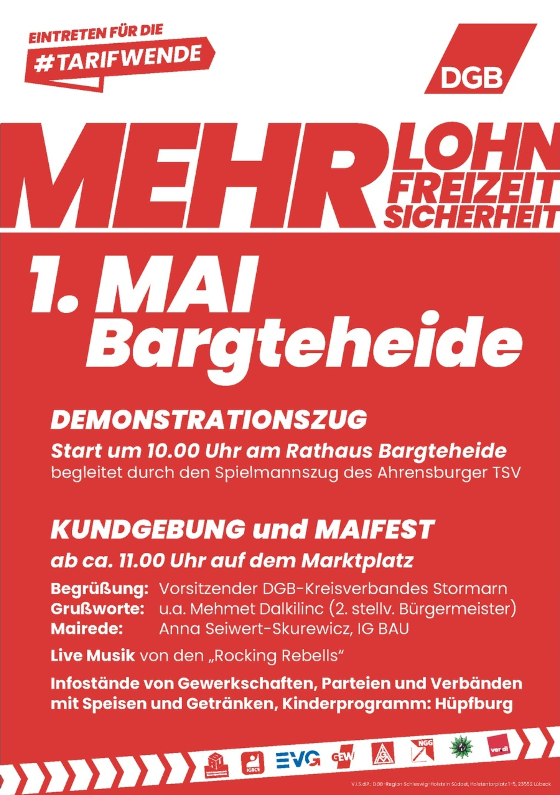 „Mehr Lohn, mehr Freizeit, mehr Sicherheit“ lautet das Motto der diesjährigen Mai-Veranstaltungen des DGB. In der Region Hamburg zelebrieren wir den Tag der Arbeit wieder an fünf Orten: Hamburg, Bargteheide, Bergedorf, Harburg und Stade.