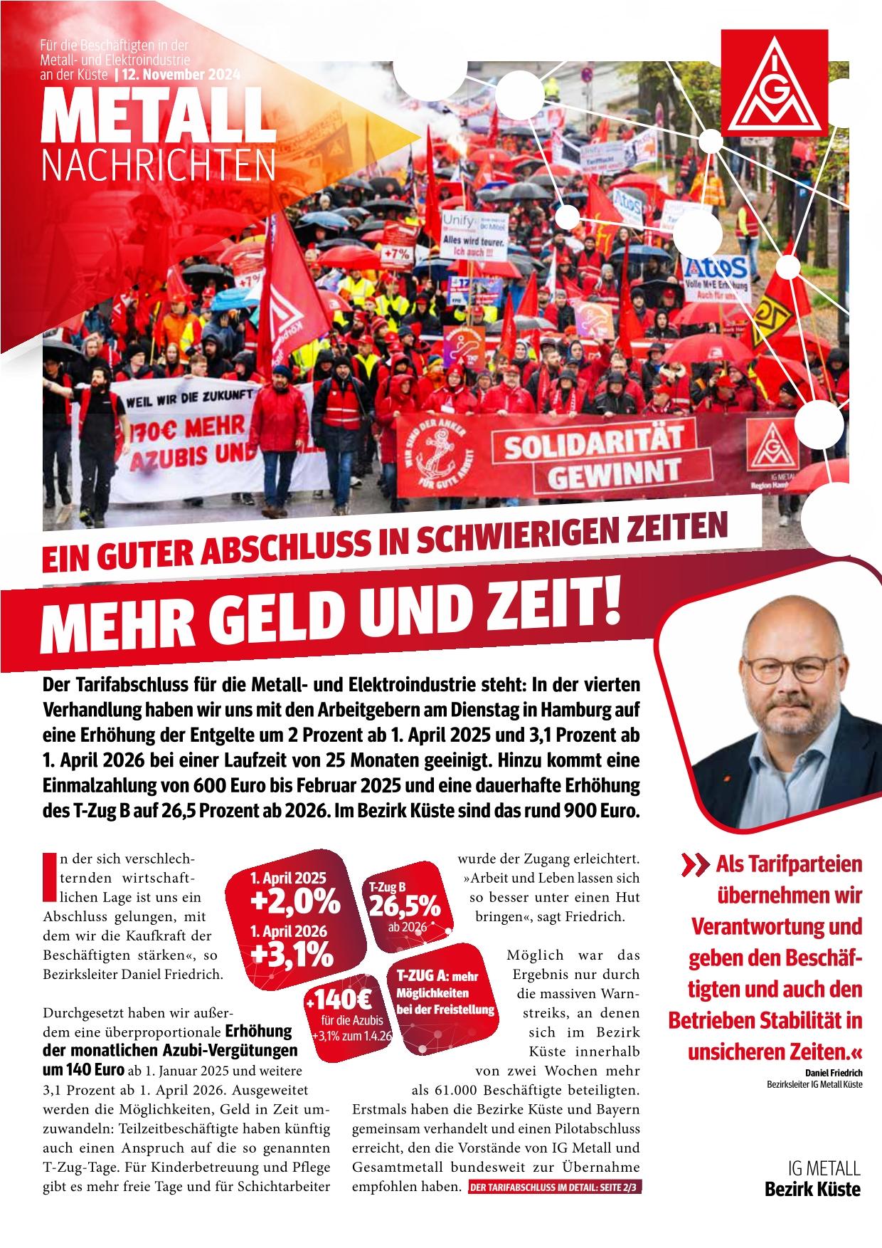 Die IG Metall Küste hat zusammen mit der IG Metall Bayern in Hamburg ein Pilot-Verhandlungsergebnis für die Beschäftigten in der Metall- und Elektroindustrie erzielt: Nach einer Einmalzahlung von 600 Euro bis zum 1. Februar 2025 steigen die Monatsentgelte ab April 2025 um 2,0 Prozent sowie um weitere 3,1 Prozent ab 1. April 2026.
