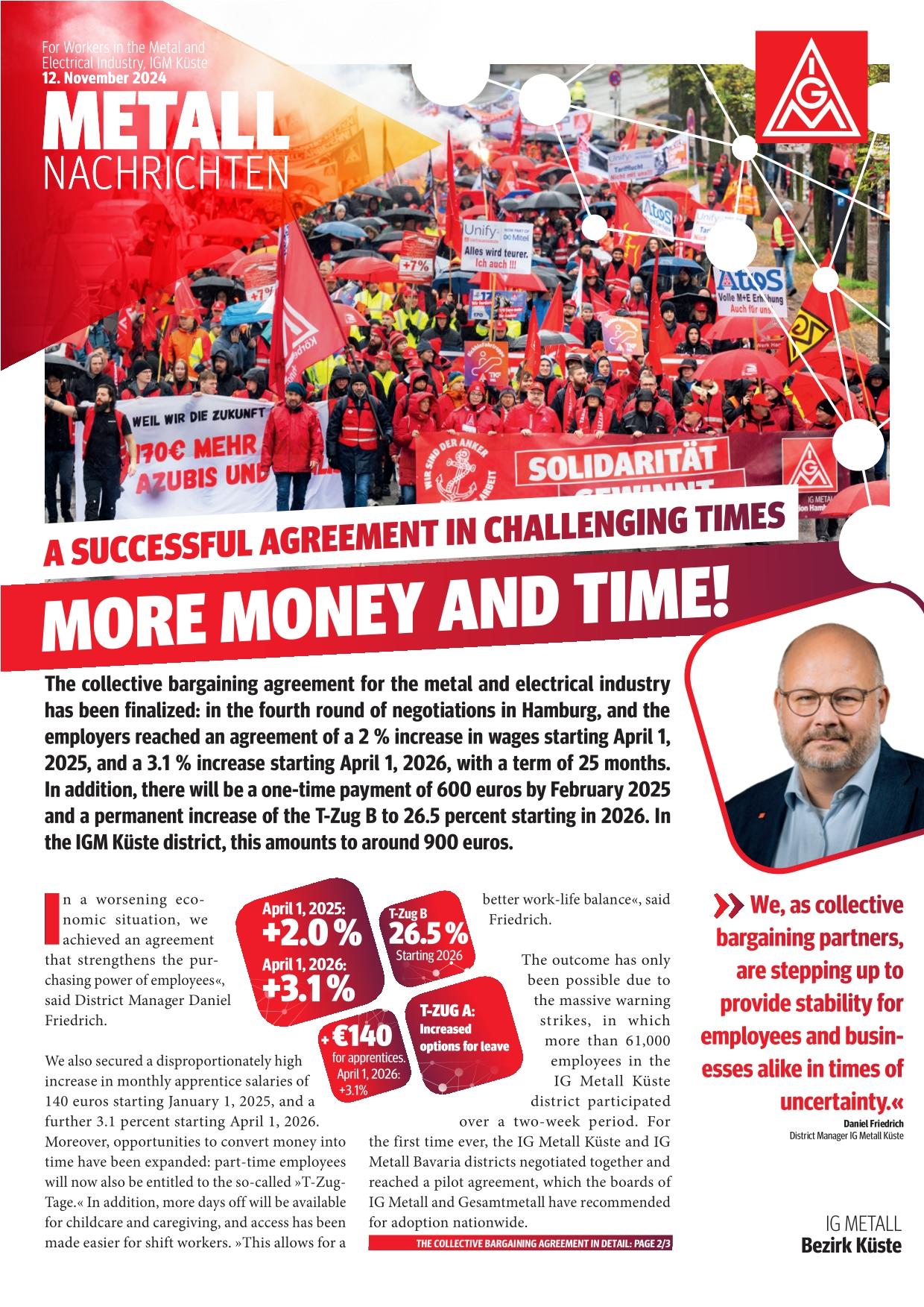 Der in Hamburg von den IG Metall-Bezirken Küste und Bayern ausgehandelte Tarifvertrag über Entgelte läuft bis zum 31. Oktober 2026. Der Vorstand der IG Metall empfiehlt die Übernahme des Pilotergebnis in allen Tarifgebieten durch die demokratischen Gremien in den Bezirken der IG Metall. Die Übernahmeverhandlungen laufen.